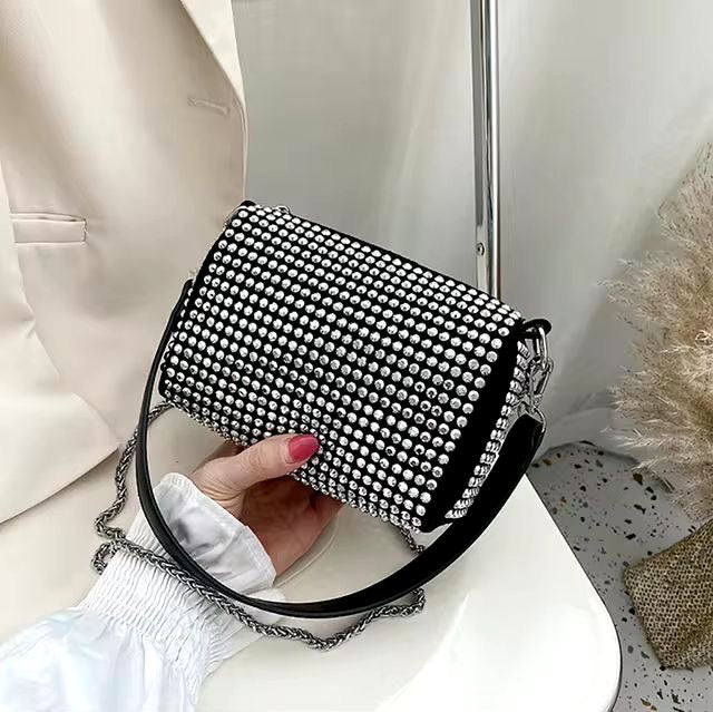 Elegant black mini shoulder bag with rhinestone studs and chain strap. Perfect for parties, evenings, and chic everyday outfits.
